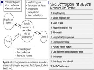 This document summarizes substance use disorders. It defines substances such as alcohol, opioids, cannabinoids, sedatives/hypnotics, cocaine, caffeine, hallucinogens, and tobacco. It describes how to identify substance use disorders through self-report data, analysis of bodily fluids, clinical signs and symptoms, and informant history. It then explains different classifications of substance use disorders including acute intoxication, harmful use, dependence syndrome, tolerance, withdrawal states, psychotic disorders, amnesic syndromes, and residual/late onset psychotic disorders. It provides examples of each classification.