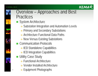 This document discusses approaches and best practices for substation integration and automation. It provides an overview of system architecture, communication protocols, and a utility case study. The key points are: