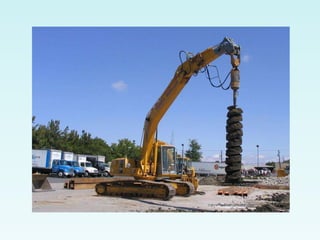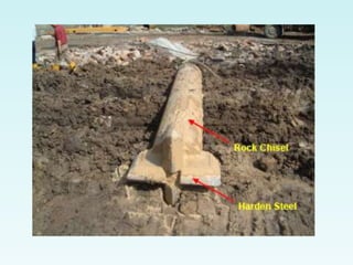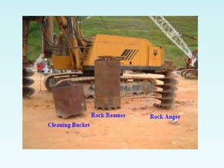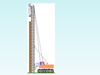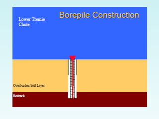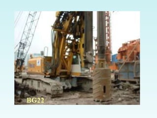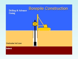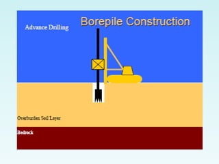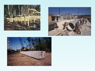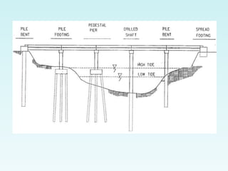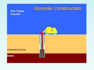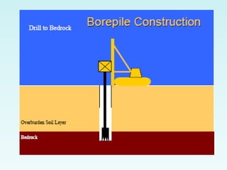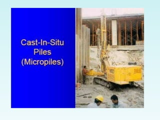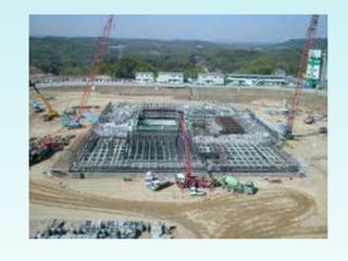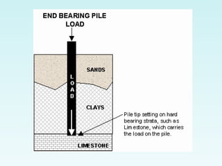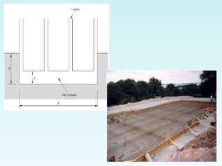 This document provides an overview of building substructures and foundations. It discusses the main types of shallow foundations, which are suitable for smaller buildings, including pad footings, strip footings, and raft foundations. It also discusses deep foundations, which are required for larger buildings or where soil conditions require foundations to be placed deeper, such as pile foundations. The key functions of foundations are to distribute structural loads over a large soil area, transmit loads uniformly, and provide a stable base for the building. Foundation type selection depends on factors like building loads, soil type, and cost.