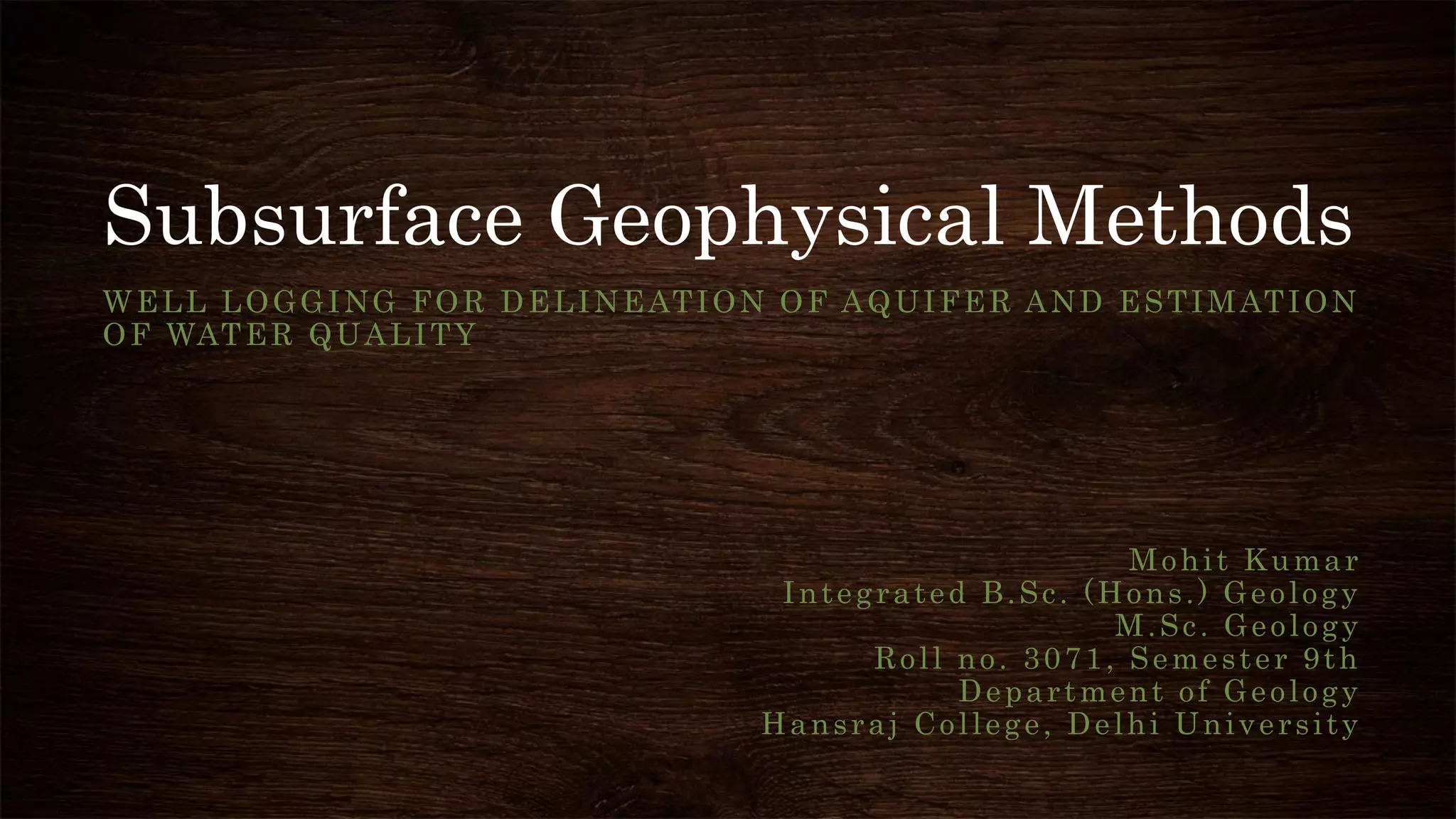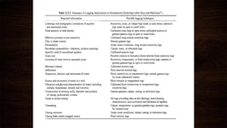 This document discusses various geophysical well logging methods used to delineate aquifers and estimate water quality, including resistivity, spontaneous potential, radioactivity, neutron, temperature, and fluid resistivity logging. Resistivity logging measures the resistivity of formations and can help determine lithology, porosity, and fluid salinity. Spontaneous potential logging indicates bed boundaries and distinguishes shale from permeable rocks. Radioactivity logging uses natural gamma rays or gamma-gamma techniques to identify lithology and determine porosity. Neutron logging measures hydrogen content to estimate porosity and moisture levels. Temperature and fluid resistivity logging provide additional information about groundwater. These geophysical logs provide critical subsurface data for groundwater exploration and management.