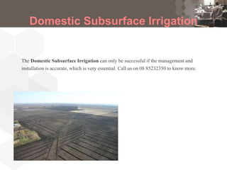 The document discusses subsurface irrigation for lawns, which involves installing underground pipes to improve soil quality and efficiently provide nutrients to plants. Successful domestic subsurface irrigation requires accurate management and installation. It highlights the benefits of using a drip method to reduce water loss through evaporation and promote sustainable watering practices.