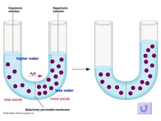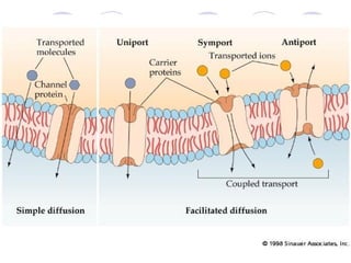 This document discusses the movement of substances across the plasma membrane in cells. It covers the structure of the plasma membrane and the different mechanisms of transport, including passive transport mechanisms like simple diffusion, osmosis, and facilitated diffusion. Active transport is also discussed, which requires cellular energy to move substances against their concentration gradient. Key differences between passive and active transport are compared.