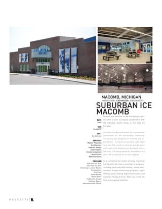 Suburban Ice Macomb is a 70,000 square foot recreational facility in Macomb, Michigan designed by Rossetti to serve the surrounding community. It features two NHL-sized ice rinks that provide flexibility and maximize open skate time. The design allows for a potential third rink to accommodate growing demand. The facility hosts youth and adult hockey, figure skating, public skating, and other winter activities.