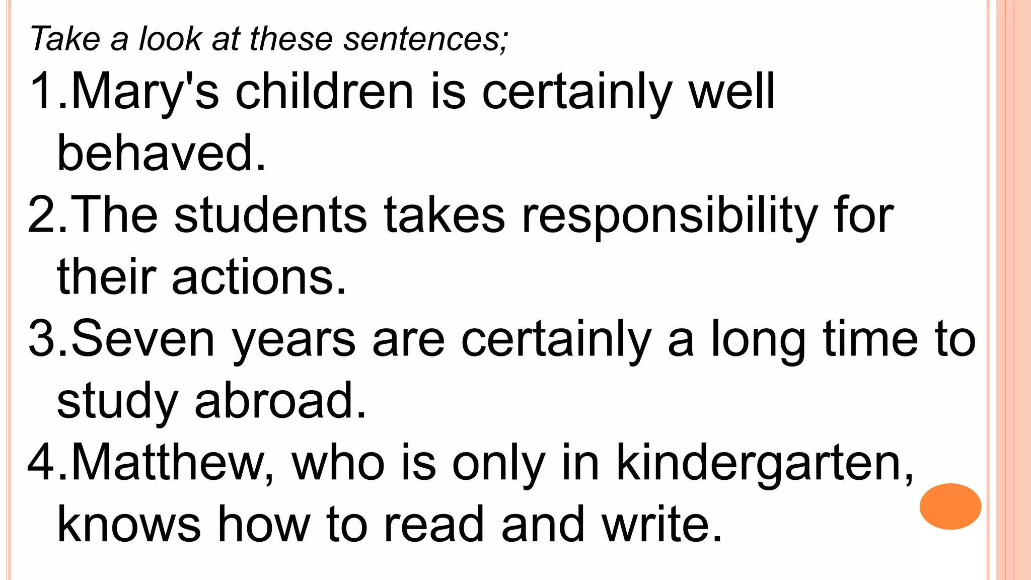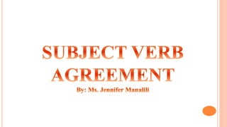 This document provides rules and examples for subject-verb agreement in English grammar. It discusses when singular and plural verbs are used based on whether the subject is singular or plural. Some key points covered include: