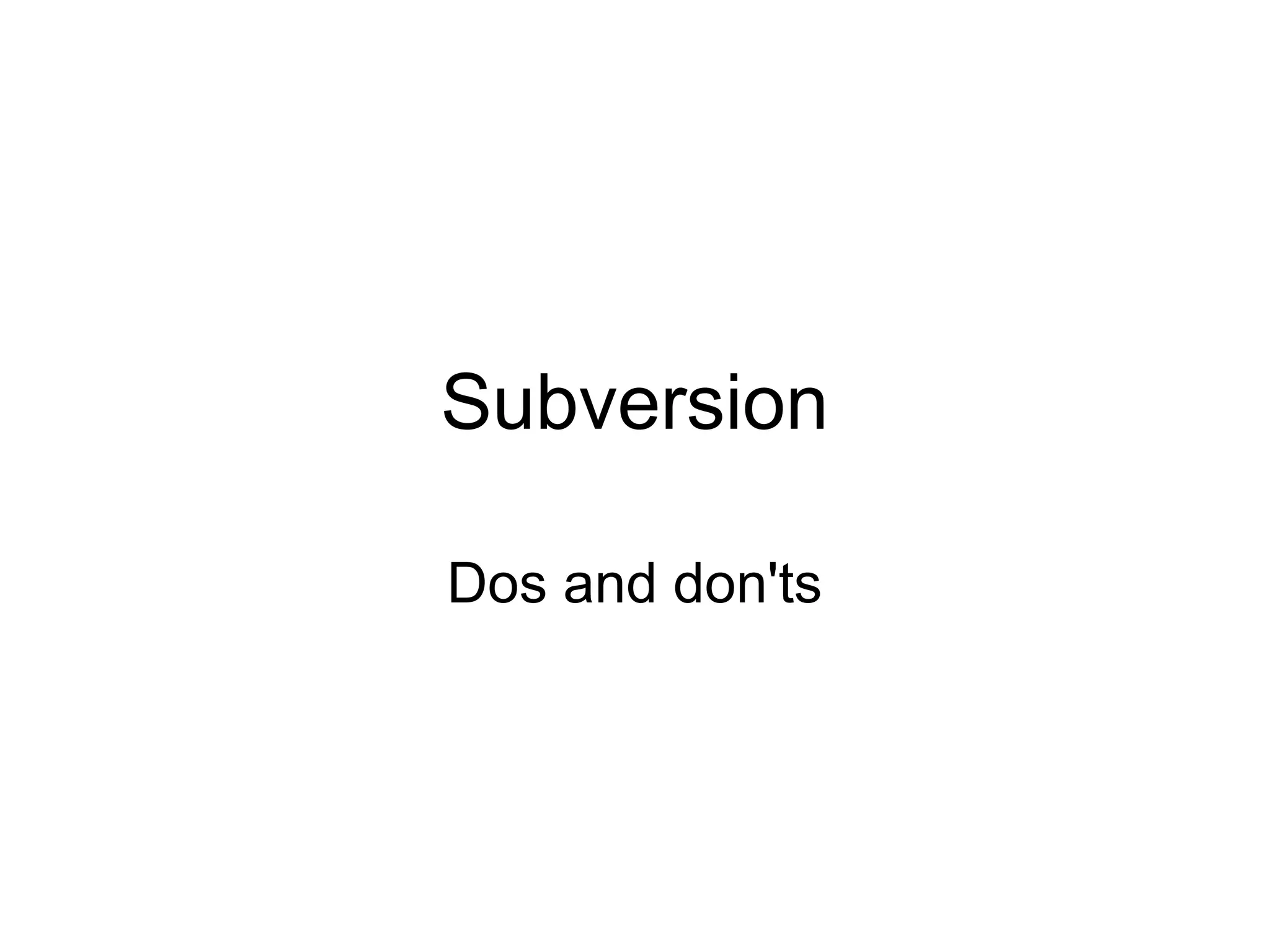 The document provides guidance on using Subversion (SVN) for source control. It discusses SVN advantages over other systems, best practices for committing files, getting a working copy, resolving conflicts, and integrating with bug tracking tools. Frequent updates and commits are recommended. The glossary defines common SVN terms.