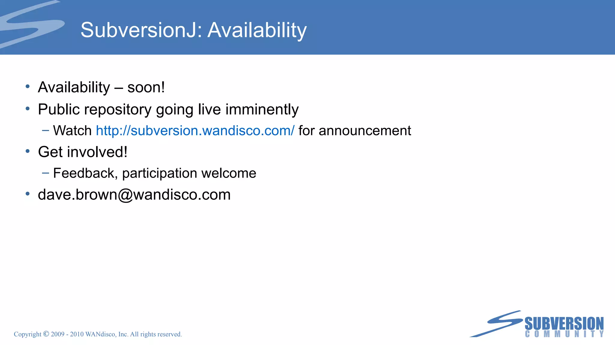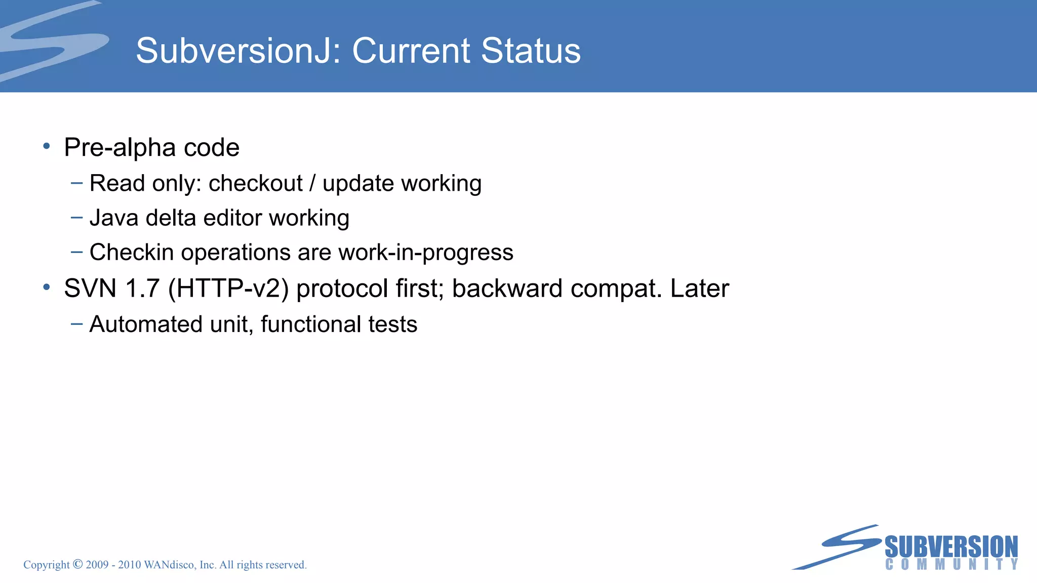 The document discusses the release of Subversion 1.7, highlighting the new HTTPv2 protocol designed to improve performance, compatibility, and developer extensibility. Key features include a next-generation working copy (wc-ng), an obliteration tool for history management, and server-side Java bindings (SubversionJ) for enhanced integration. Additionally, it outlines community involvement opportunities and various support services offered by WANdisco to help organizations transition to Subversion.