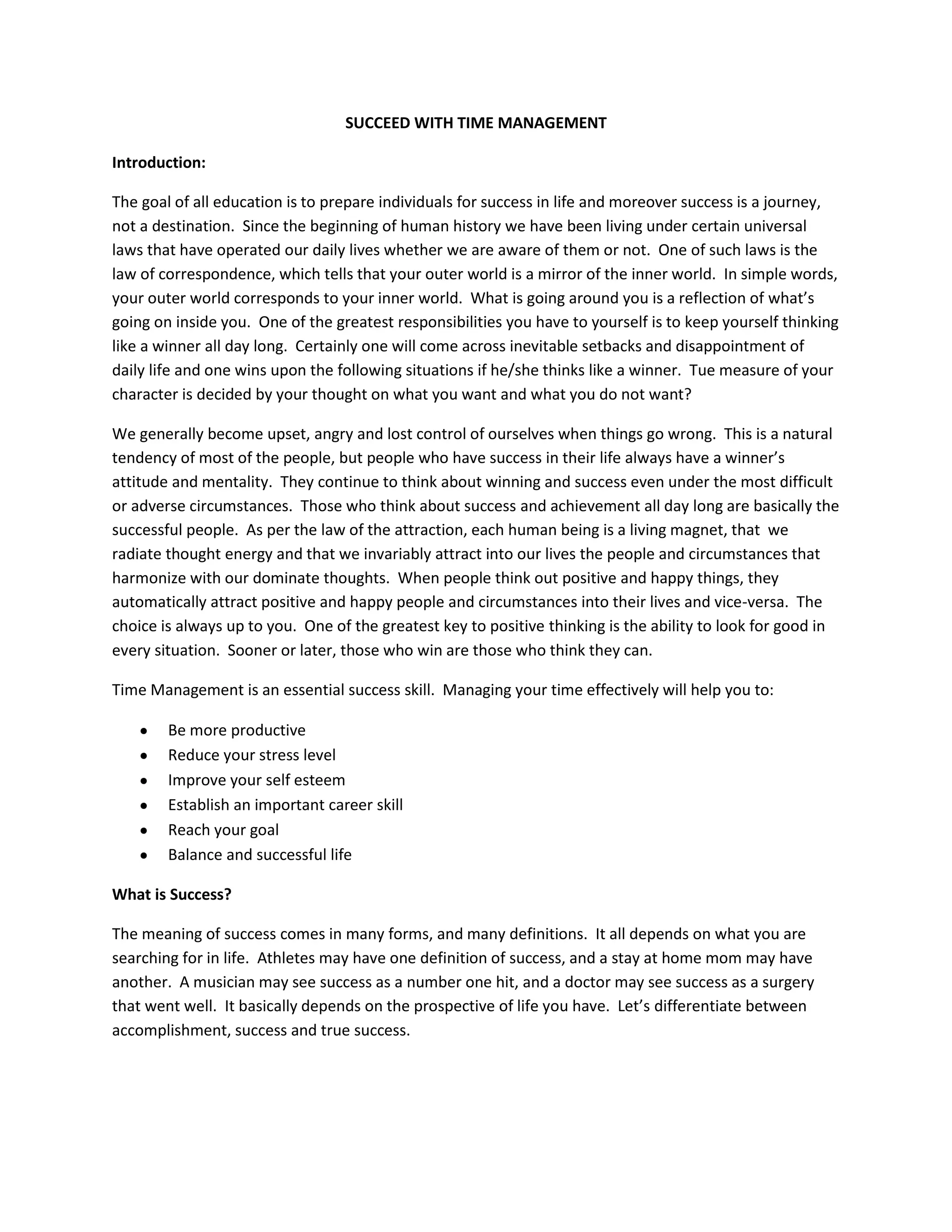 Time management is an essential skill for success. It involves analyzing how time is currently spent, identifying time wasters, setting goals and priorities, and creating a schedule to efficiently complete tasks. Effective time management allows one to be more productive, reduce stress, improve self-esteem, and balance one's life. While time cannot be saved, proper use through time management techniques can help achieve goals and maximize productivity within the 24 hours everyone is given each day.