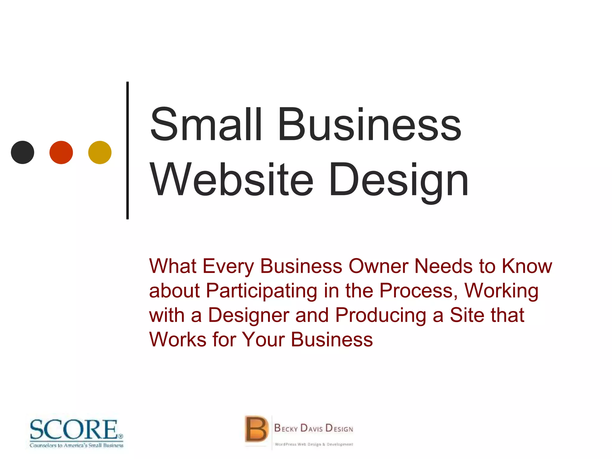 This document provides an overview of the website design process for small businesses. It discusses planning content and structure, different types of sites, budgets, domains and hosting, finding designers, contracts, the design and development process, pre-launch testing, ongoing maintenance, and marketing the completed site. Business owners are advised to thoroughly plan content and functionality before hiring a designer, provide timely feedback during the process, and budget for ongoing maintenance and marketing after launch.