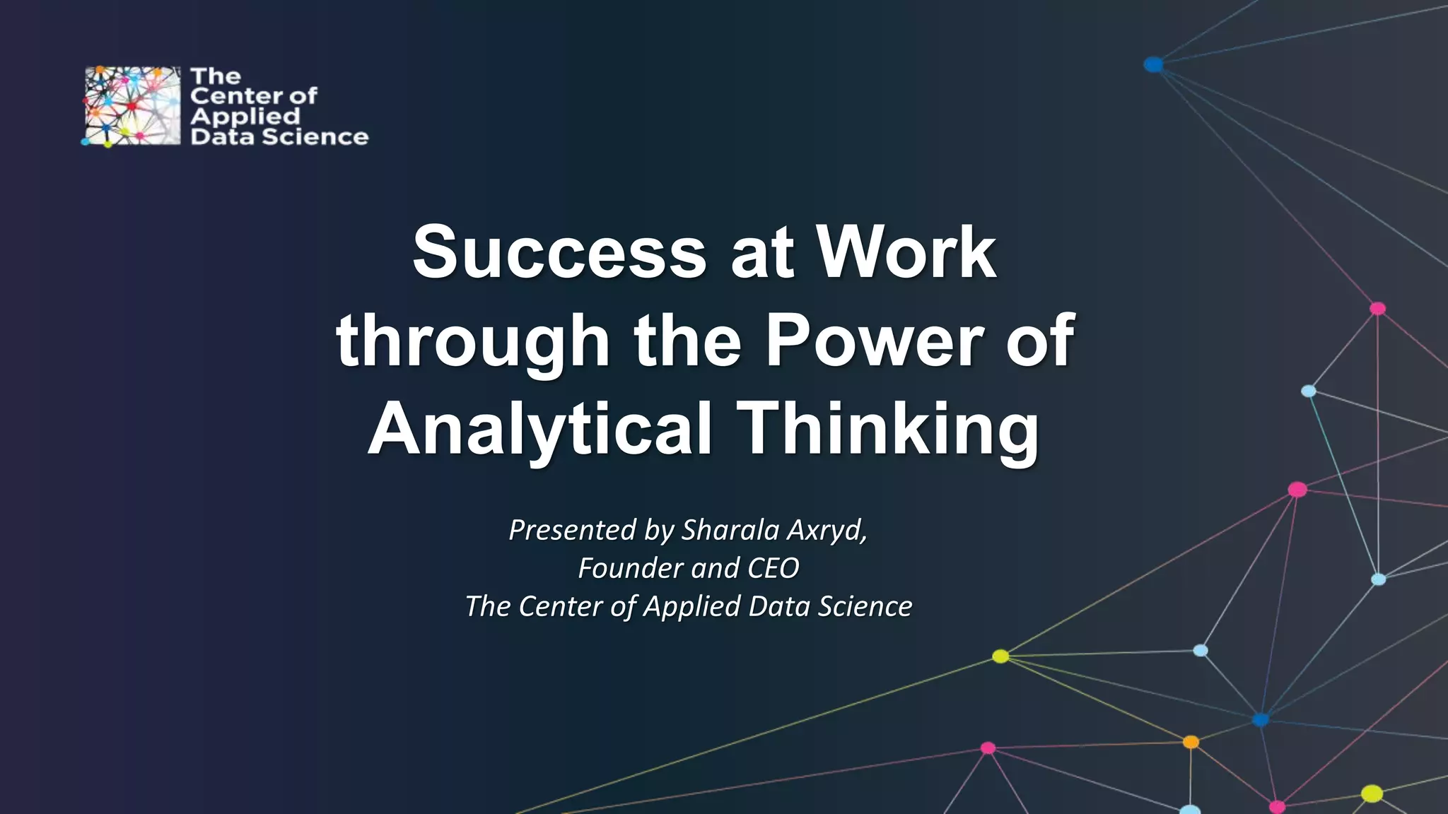 The document is a presentation about success at work through analytical thinking presented by Sharala Axryd of The Center of Applied Data Science (CADS). CADS aims to make the world more sustainable through technology, insights, and intelligence. They educate clients on data management, integration, and analysis to empower clients and enable their independence from CADS services. The presentation discusses crucial 21st century skills like analytical thinking, creativity, and communication skills. It also notes that training for soft skills is the top priority for talent development and discusses how digital technologies can transform industries like oil and gas.