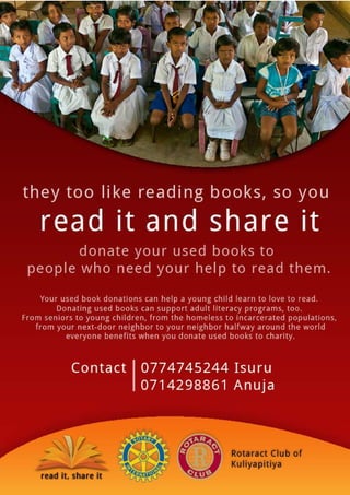 The document provides information about the Rotaract Club of Kuliyapitiya, including a summary of their activities in the first quarter of 2012. It discusses the club's founding and first projects like planting herbs to save lives, donating English books to a local school, and providing food to pilgrims on an important religious day. The club aimed to serve their local community through social activities and help develop the members' skills through projects and professional development opportunities.