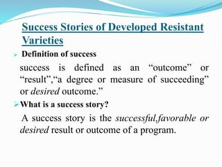 This document discusses success stories of developing disease-resistant plant varieties through conventional breeding and genetic engineering techniques. It provides examples of transgenic crops with enhanced traits like increased yield, nutritional quality, stress tolerance and pest resistance. Specifically, it mentions golden rice which was engineered to produce beta-carotene, and virus-resistant plants containing viral coat proteins. The document also discusses delayed fruit ripening tomatoes and insect-resistant Bt crops. Overall the document outlines major advances in developing stress-tolerant and nutritionally-enhanced transgenic crops.