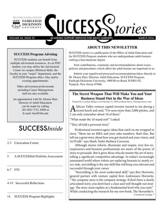 This document provides information about advisement resources for SUCCESS program students at Fairleigh Dickinson University. It lists the Advisement Center, faculty advisors in academic departments, and the SUCCESS Program office as advising options for students. It provides contact information for the Director of Adult Education, Dr. Denise Hart, to schedule an appointment. It also previews the topics that will be covered in the upcoming issue of the SUCCESS Stories newsletter, including the curriculum corner, a portfolio assessment, and program highlights. The newsletter is a publication for undergraduate adult learners in the SUCCESS program. Students are encouraged to submit recommendations or comments to Dr. Hart to provide feedback that can help adult learners.