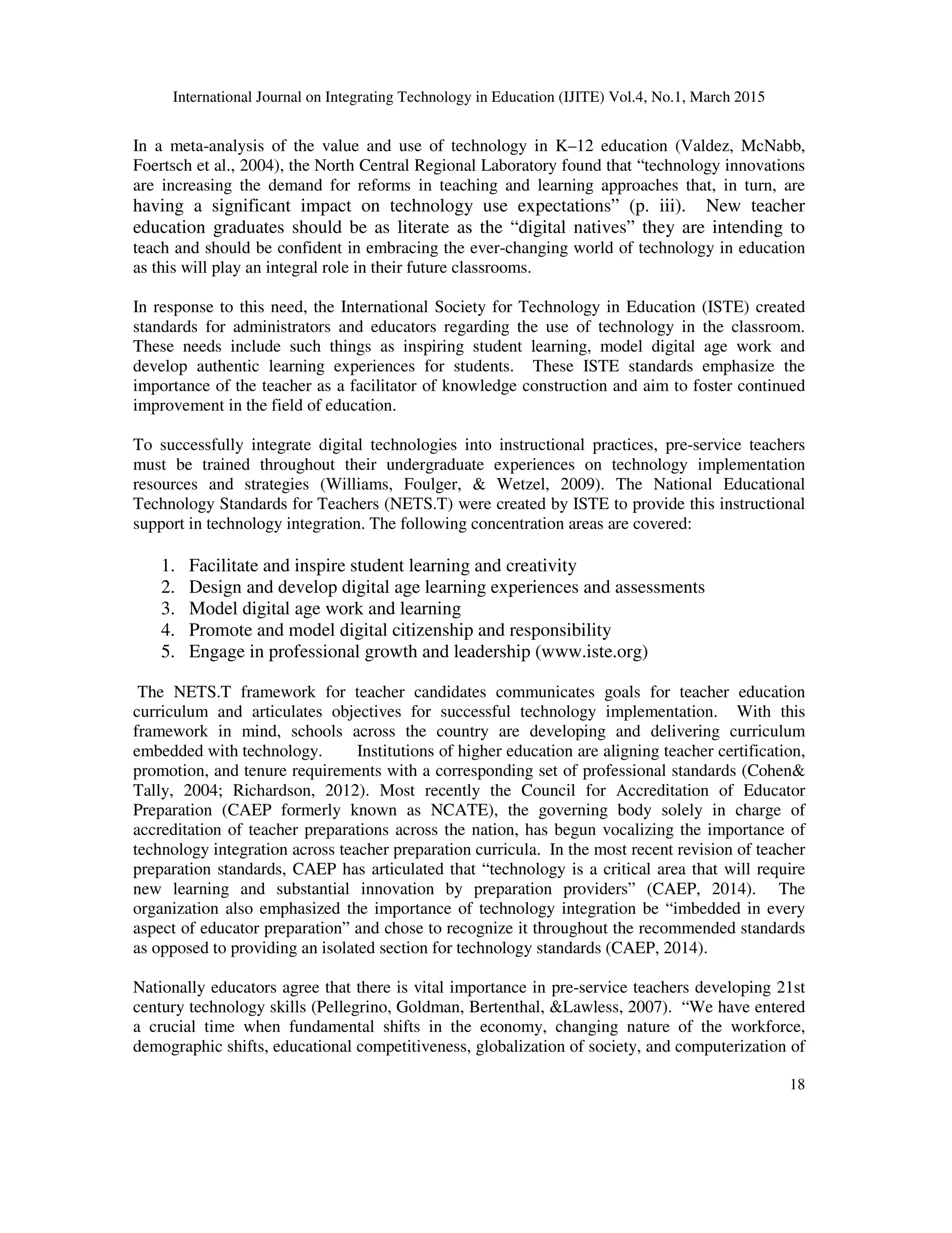 The document discusses the critical need for technology integration in teacher preparation programs, emphasizing the TPACK (Technology, Pedagogy, and Content Knowledge) framework to effectively prepare pre-service teachers. Despite the recognition of technology's importance, many programs still follow outdated, skill-focused approaches rather than embedding technology within pedagogy throughout the curriculum. The paper explores themes such as building student confidence in technology use, leadership modeling, and the necessity of assessment for successful technology integration in teacher education.