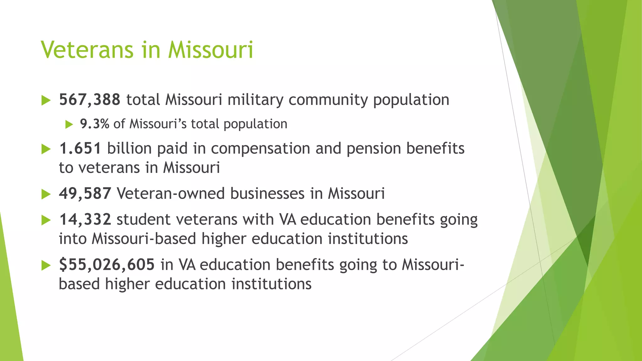 This document discusses student veterans at Metropolitan Community College (MCC) in Missouri. It provides statistics on the veteran population in Missouri as well as the number of student veterans at MCC campuses. It also summarizes the demographics of student veterans at Penn Valley campus and discusses some of the challenges student veterans face in navigating the college process from pre-enrollment to graduation. Finally, it offers suggestions for assisting student veterans and providing a veteran-friendly experience as well as highlights some veteran resources.
