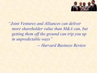 Building successful joint ventures requires careful planning and execution during the launch phase. Common mistakes include lack of commitment of resources, strategic conflicts between partners, and missed operational synergies. Key challenges are creating strategic alignment between partners, establishing an effective joint governance system, managing economic interdependencies, building a high-performing organization, and putting together a capable management team. Attention to details like goals, resources, controls, and communication are critical to address these challenges and get the joint venture off to a strong start.