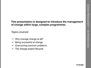 This document provides guidance on successfully managing change programmes. It discusses the importance of managing change to solve business problems and realize benefits. Common change programme problems are also outlined. Key recommendations include having strong programme governance and leadership, focusing on proactive benefits realization, ensuring business engagement, aligning solutions to business needs, and embedding changes through support and cultural shifts. Change management is multidimensional and requires addressing people, processes, technology and culture.