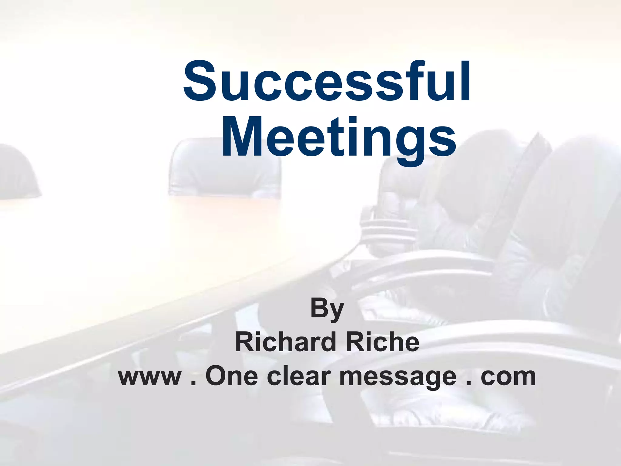 This document provides tips for holding successful meetings. It recommends having a clear purpose for the meeting, inviting the right attendees, and distributing an agenda in advance. It also suggests preparing by printing agendas, arranging seating, ensuring technology is ready, and having supplies. During the meeting, it is important to focus on one topic at a time, keep discussions on track, and summarize decisions made with clear action items and deadlines assigned. The meeting should start and end on time, with minutes published afterwards.