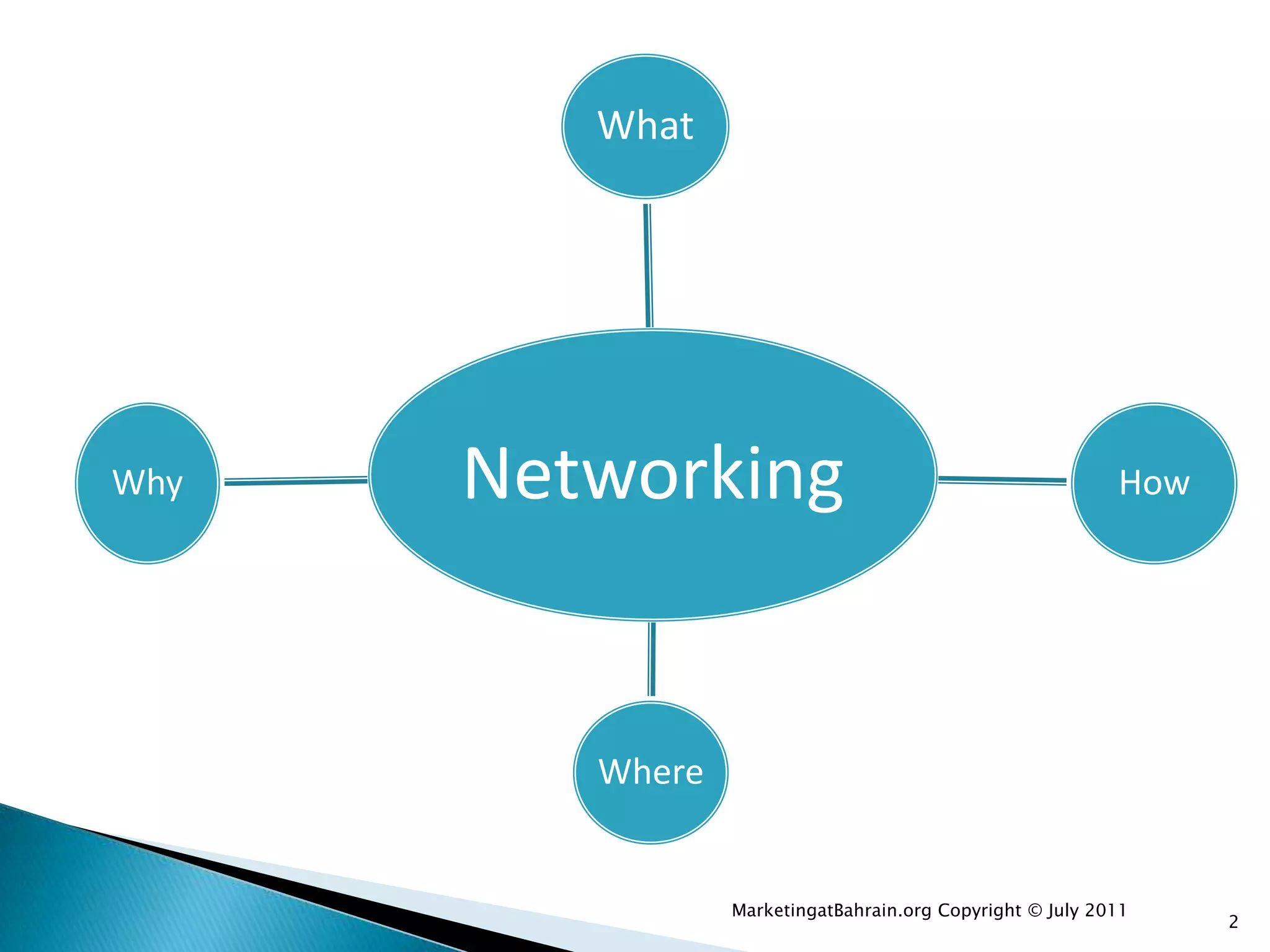 The document discusses networking and provides tips for career changers. It defines networking as "a process where you develop long term relationships with others for mutual benefit." It notes that networking involves building relationships, not just collecting contacts, and is a two-way process where you both provide and receive assistance. The document provides advice on developing a networking strategy, important skills like listening and building rapport, and suggests networking can happen anytime and anywhere by meeting people individually or at group events.