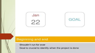 Successful project management involves completing a project within defined time and budget constraints while achieving the specified goals. It requires having the right skills and knowledge to efficiently manage limited resources and build good stakeholder relationships. Project benefits are the gains delivered by a project and are defined in early documents, while project management provides better control, accomplishes more work in less time and with fewer resources, increases quality, and reduces risks and failures. It also ensures projects deliver value and manage risks to align with business strategies and goals.