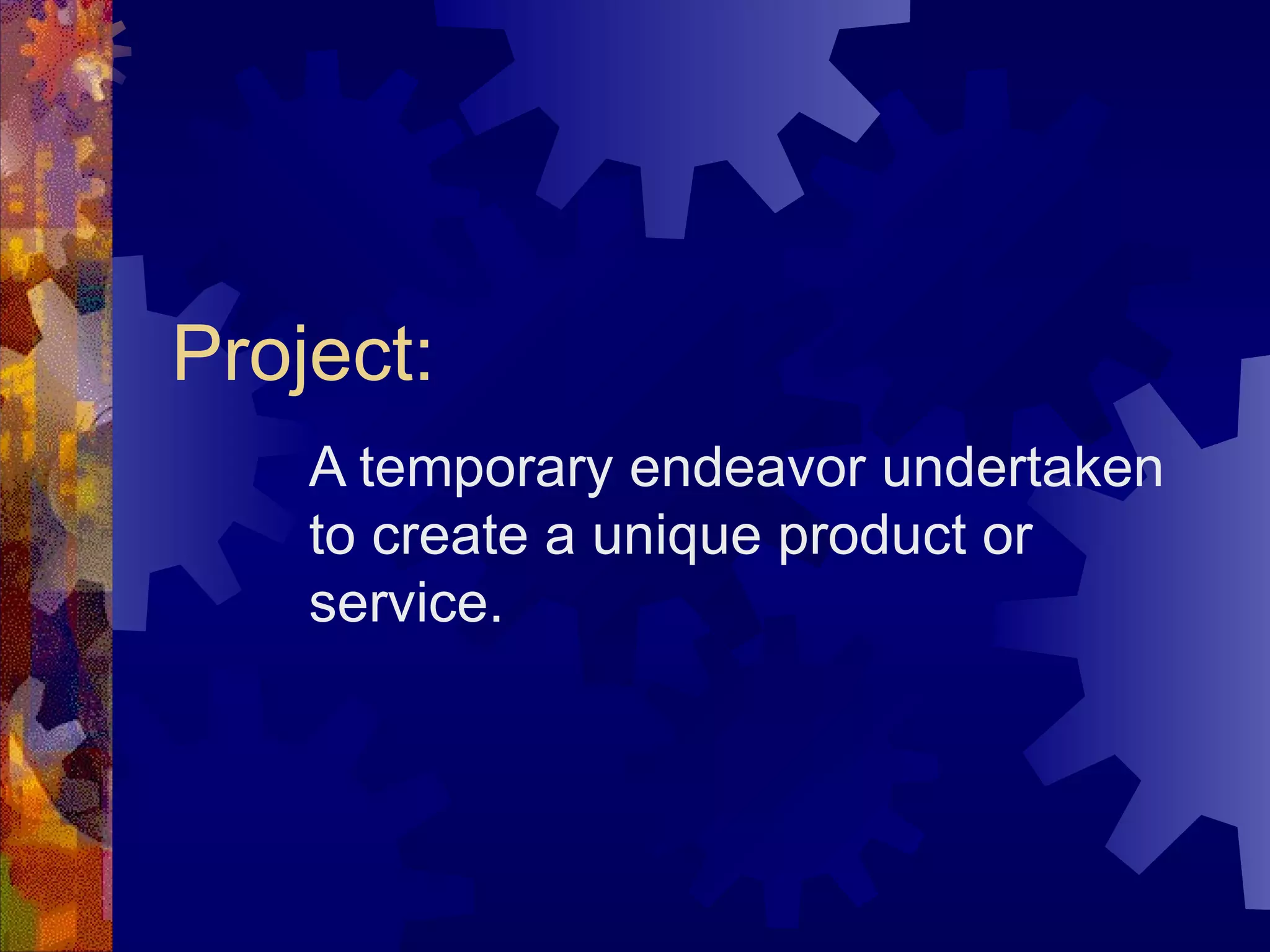 The document discusses the key aspects of successful project management including defining a project, the knowledge areas and processes involved, and important skills for project managers. It outlines the typical project phases of conceptual design, development, testing, and deployment. It also explains the importance of stakeholders and managing scope, time, costs, quality, and risk to meet stakeholder needs and complete the project objectives.