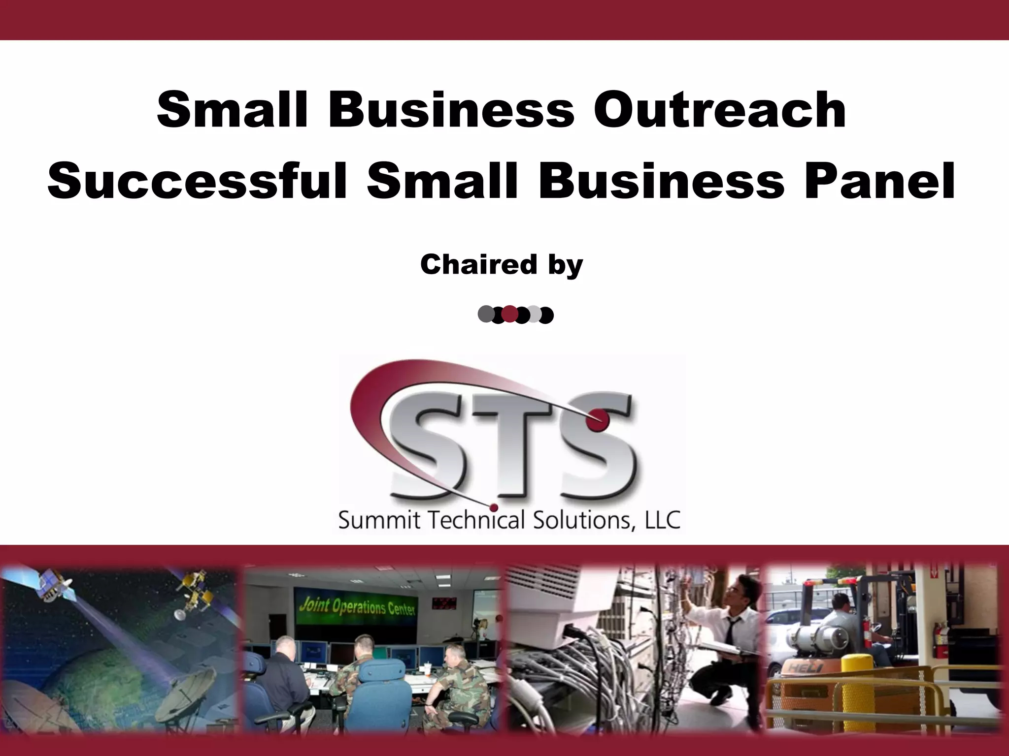 The document summarizes presentations from a small business panel discussing their companies' successes and secrets to success. Kelly Terrien of Summit Technical Solutions discussed their IT services and commitment to excellence. Buddy Gilmore of Shape Technologies emphasized calculated risks and empowering staff. Kathleen Meyer of The Trestle Project discussed business coaching services. Kevin O'Neil of Braxton Technologies outlined their engineering services and principles of visibility, relationships, and transparency.