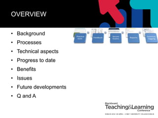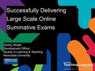 The document outlines an initiative by Newcastle University to implement large-scale online summative exams, focusing on enhancing assessment and feedback for students and staff. It details the processes, technical aspects, benefits, and challenges of the project, including the involvement of various departments and tools used to facilitate online exams. Future developments include integrating multimedia, using tablets for shorter exams, and expanding delivery to international locations.