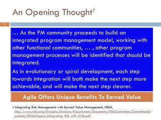 The document discusses the integration of Agile methodologies with Earned Value Management (EVM) to enhance the success of software-intensive defense programs. It outlines the shortcomings in traditional project management practices and presents core principles for connecting Agile and EVM, such as measuring progress through working products and iterative development. The document emphasizes the need for improved communication and adaptability in project management to align with customer requirements and evolving project needs.