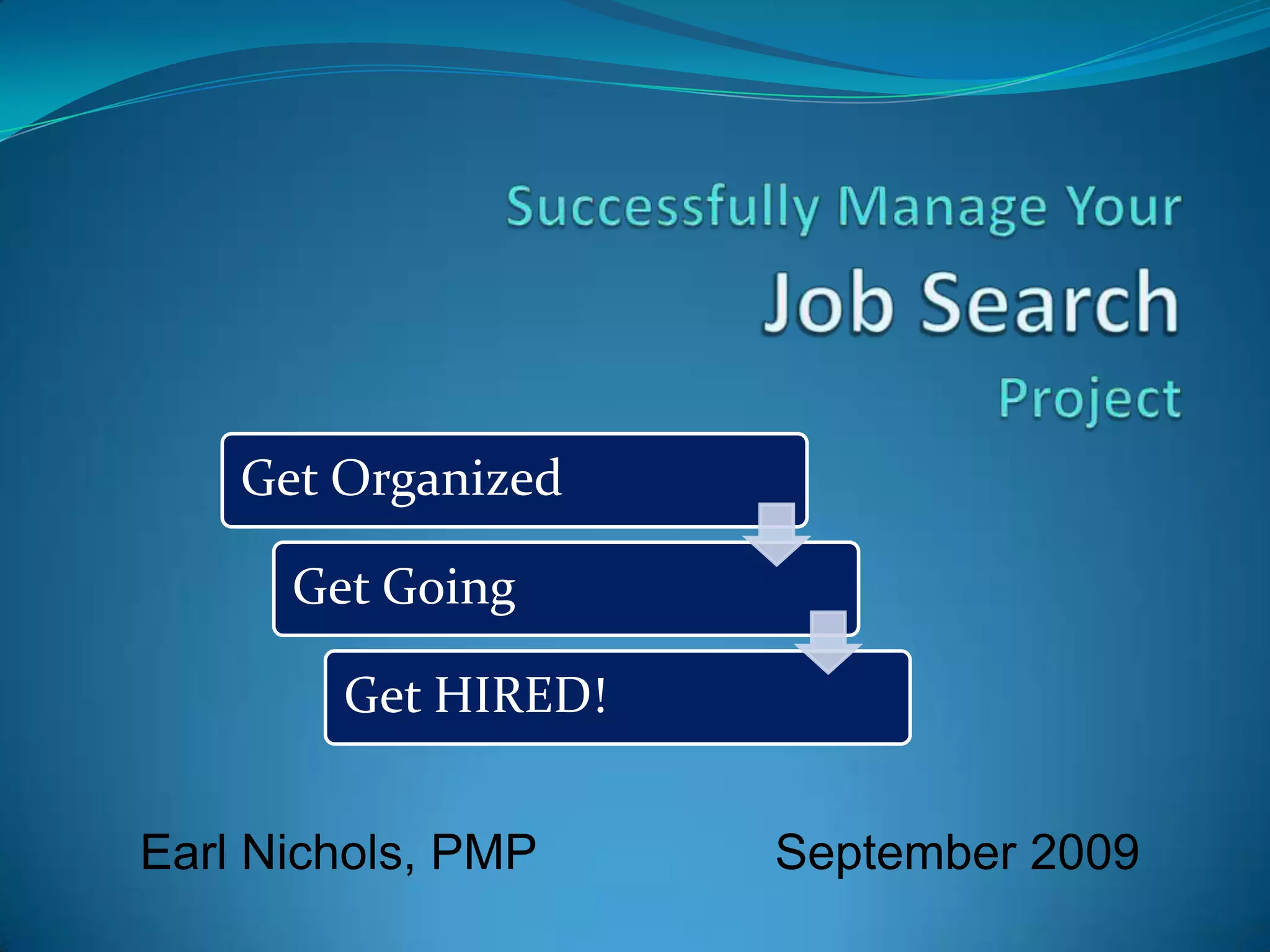 This document outlines the phases and strategies for managing a job search project. It discusses getting organized by defining professional objectives and target markets. The planning phase involves creating core messages, accomplishment statements, and networking resources. The executing phase focuses on networking and using recruiters, job boards, and personal contacts to generate leads. Monitoring and controlling the project involves setting accountability and getting support from a work team. The goal is to plan the work, spend time networking, and not stop searching until receiving a job offer.