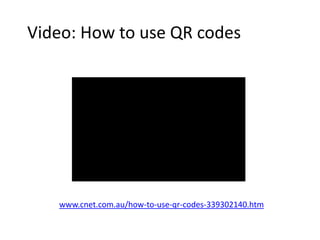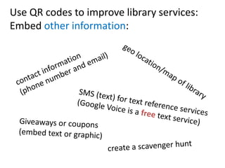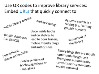 This document discusses how libraries can use QR codes to connect physical materials like books to digital content online. It provides examples of using QR codes to link to library websites, videos, databases and other online resources optimized for mobile access. It also discusses different free online tools that can be used to create QR codes and embed them in physical signs, books, and materials in the library.