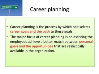 This document discusses career planning and succession planning. It provides details on the employee career planning process, which involves self-assessment, managerial assessment, information evaluation, and creating a plan. It also discusses what employees and managers can do to support career planning. For succession planning, it identifies the need to ensure critical skills and knowledge are maintained when employees leave key roles. The steps of succession planning include identifying critical positions and their competencies, identifying management strategies, documenting and implementing plans, and evaluating effectiveness.