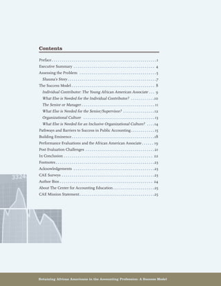 The document presents a success model for retaining African Americans in the accounting profession. It identifies three key components: 1) all stakeholders must examine their own biases and expectations to create an inclusive environment, 2) organizations must establish inclusive structures, systems and culture, such as comprehensive onboarding programs, and 3) African American associates must build their professional reputation and relationships in their first two years. The model aims to address retention by focusing on both individual associates and making changes within accounting organizations and among those who make critical career decisions, like supervisors.
