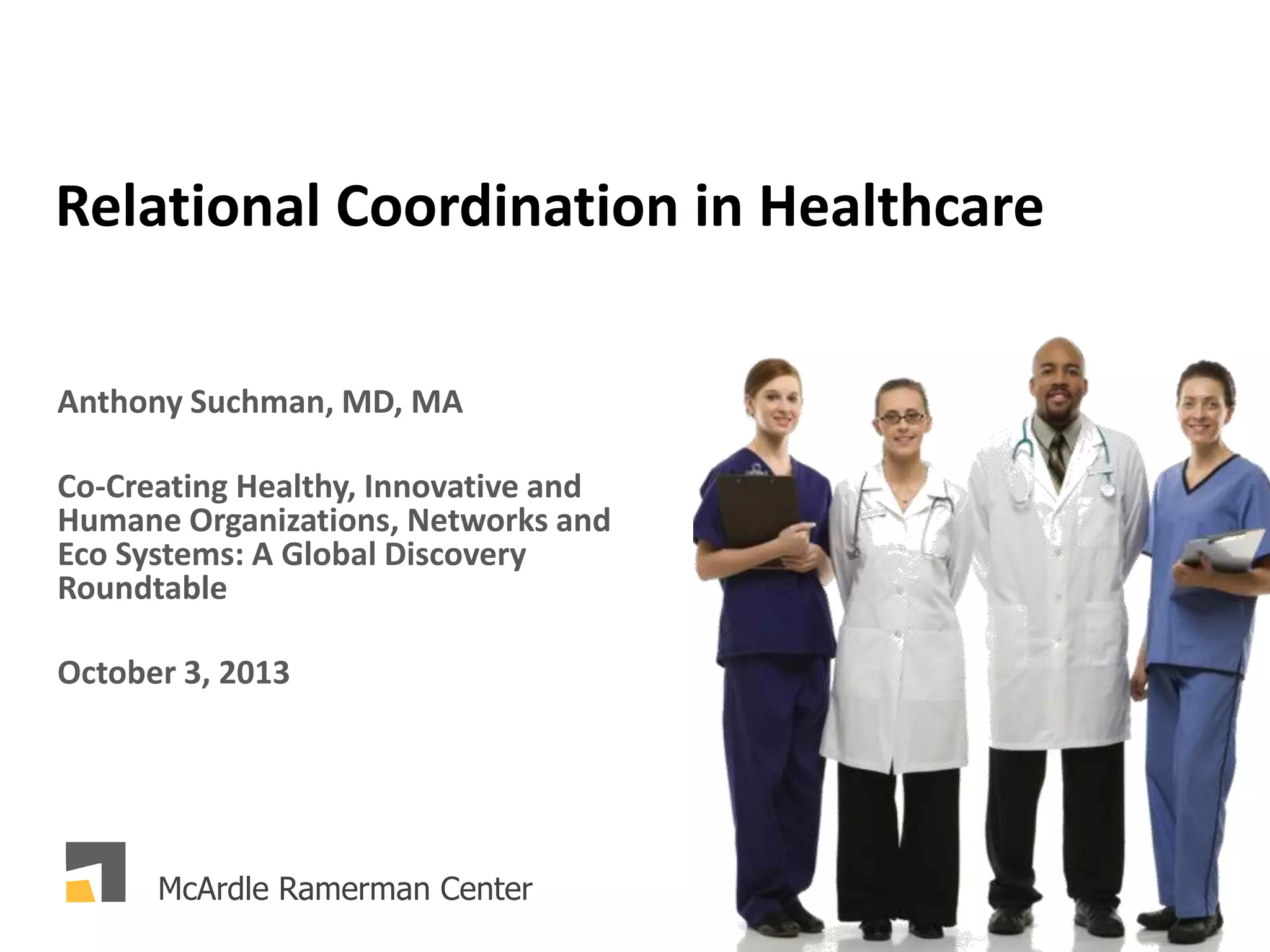 The document discusses the concept of relational coordination in healthcare, emphasizing its importance in improving organizational performance, patient care, and worker outcomes. It highlights the role of effective communication, shared goals, and mutual respect in enhancing coordination among various healthcare professionals. The findings suggest that implementing relational coordination can lead to reduced burnout, increased job satisfaction, and improved surgical performance.