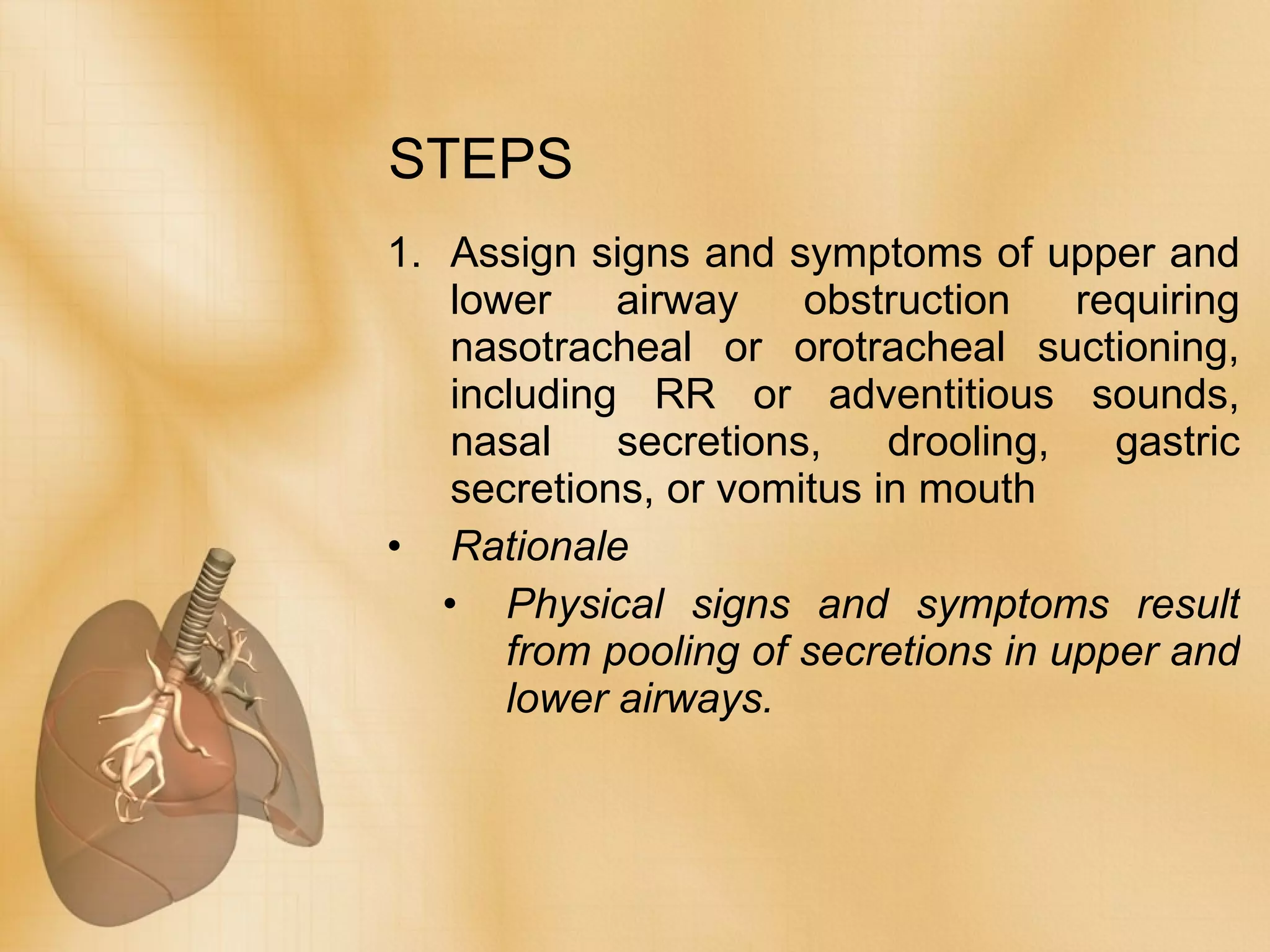 The document outlines the steps for performing oropharyngeal and nasopharyngeal suctioning procedures. Key steps include assessing the need for suctioning based on signs and symptoms, positioning the client comfortably, applying proper hand hygiene and using aseptic technique, setting the appropriate suction pressure, lubricating and inserting the catheter into the nose or mouth, and encouraging coughing to clear secretions. The procedure aims to clear secretions and promote oxygenation while preventing trauma and transmission of microorganisms.