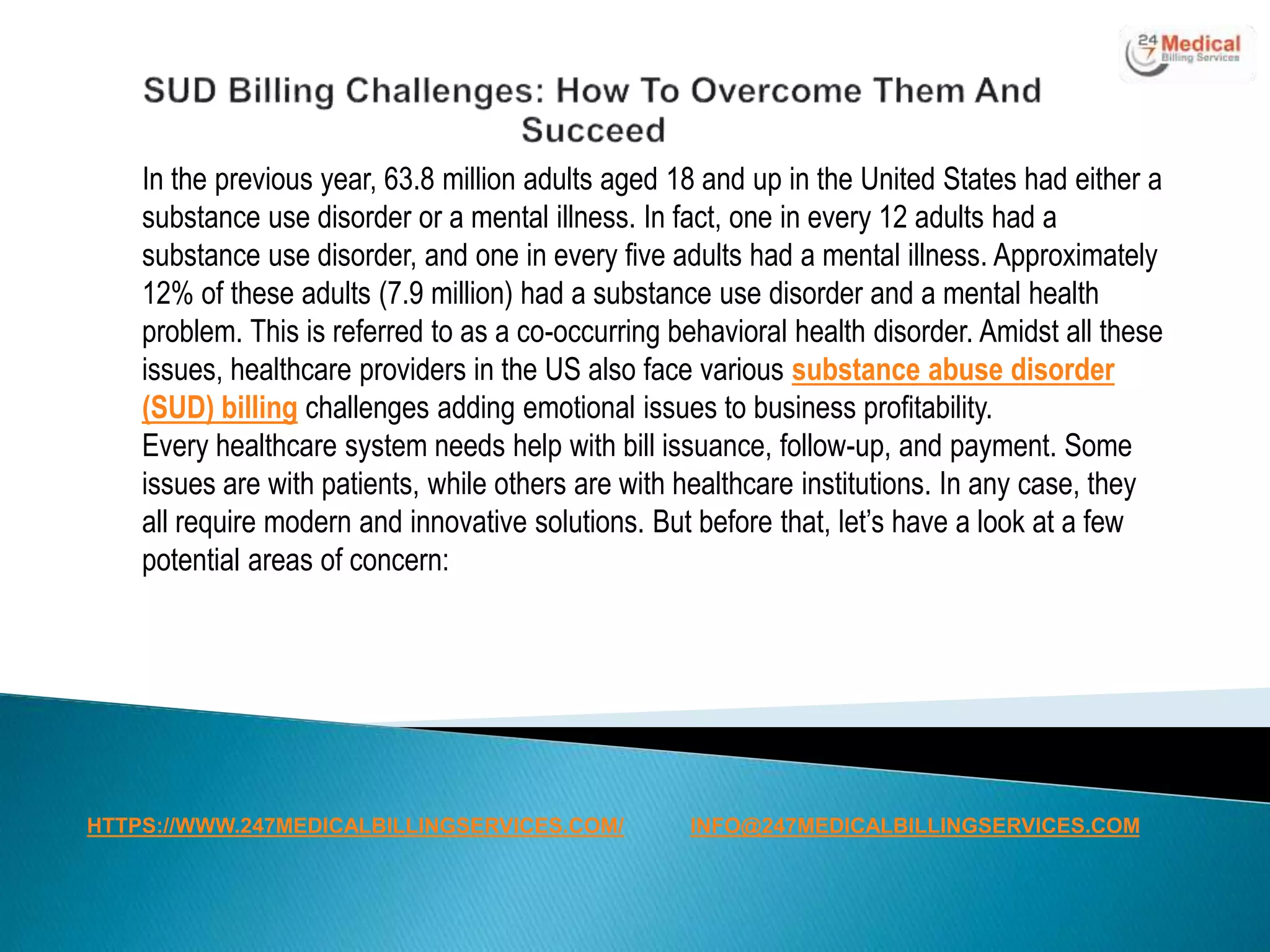 In the U.S., 63.8 million adults faced a substance use disorder or mental illness, with significant challenges in billing for healthcare providers treating these issues. Key concerns include healthcare provider burnout, financial stress, staffing shortages, compliance issues, and ethical dilemmas that impact patient care and business profitability. To address these challenges and improve operational efficiency, substance abuse treatment centers are encouraged to seek expert assistance in billing and revenue cycle management.