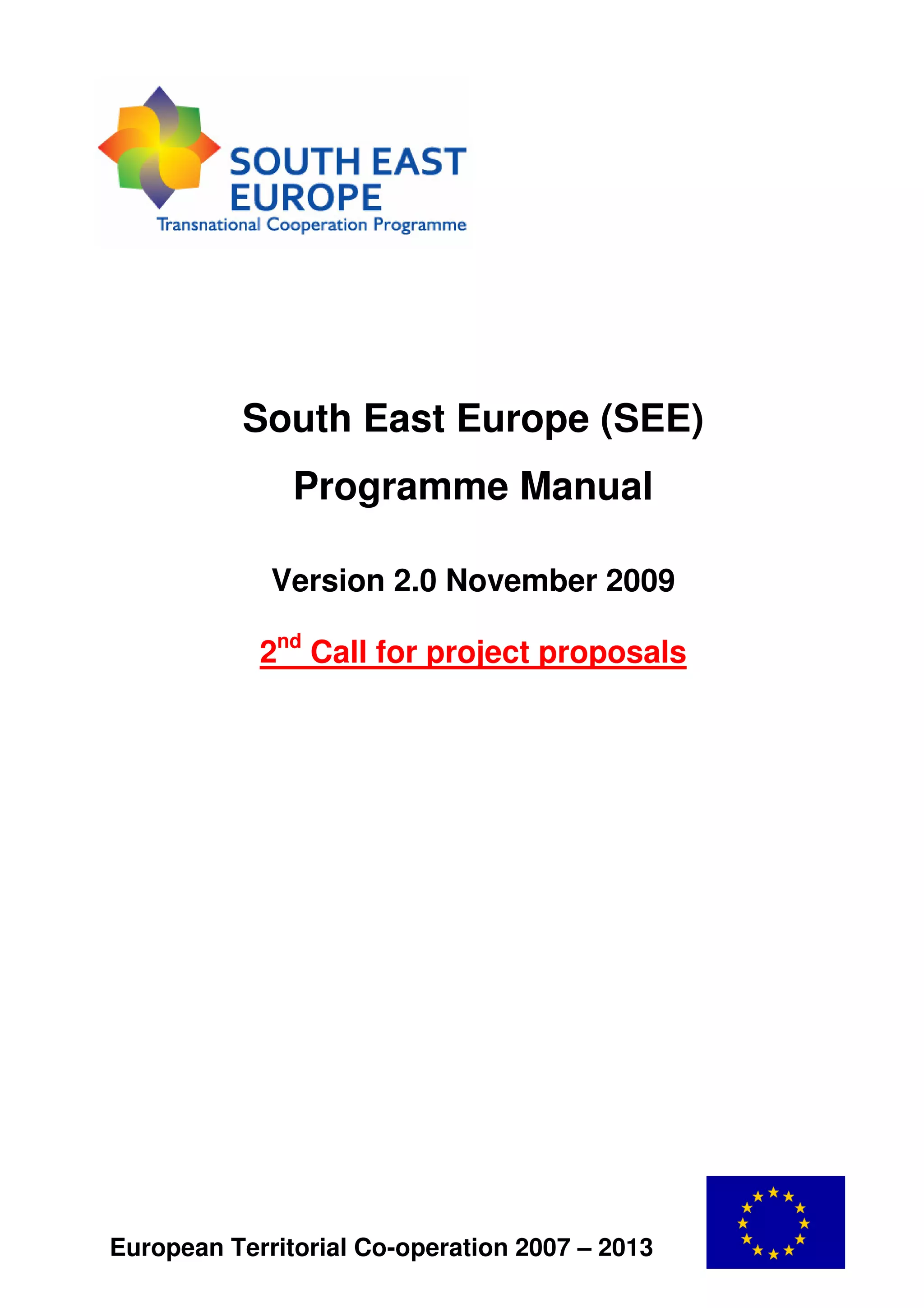 This document provides guidance on the South East Europe Transnational Cooperation Programme 2007-2013. It outlines the purpose and scope of transnational cooperation in South East Europe, the programme's priority axes and areas of intervention, roles of management bodies, contacts, financing details, and legal framework. Eligible partners include those from EU member states, candidate countries, and potential candidates. Expenditures must adhere to eligibility rules depending on the source of funding.