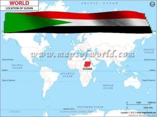 The document discusses climate change impacts in Sudan. It notes that Sudan is highly vulnerable to climate change impacts due to factors like poverty, weak resource management, and environmental fragility. Key impacts include rising temperatures, changes in rainfall patterns exacerbating droughts and floods, threats to food security and water resources, and health impacts. The document outlines Sudan's climate zones and variability in rainfall. It recommends various adaptation strategies and projects focused on sectors like agriculture, forestry, rangelands, and health to build resilience to climate change.