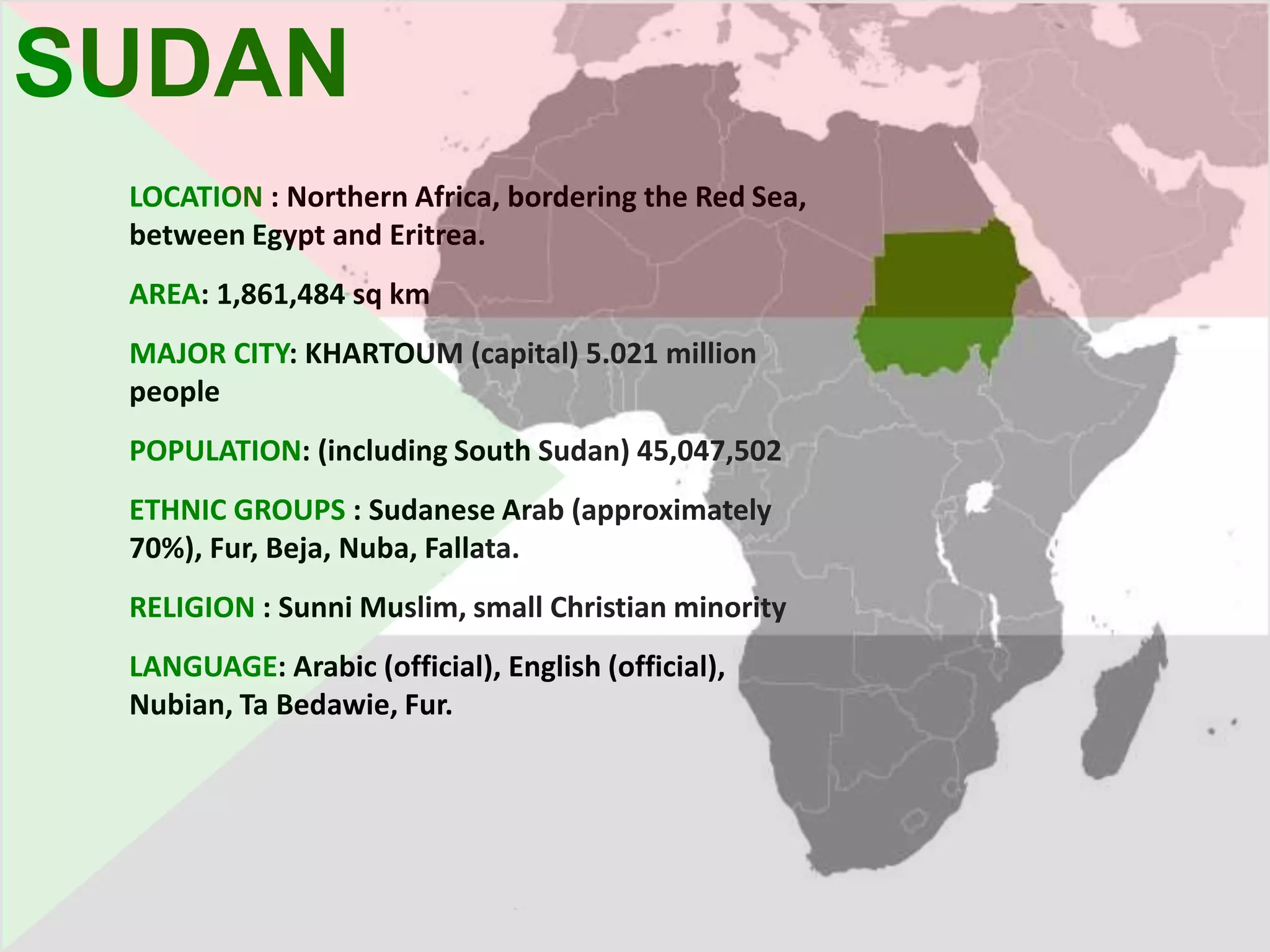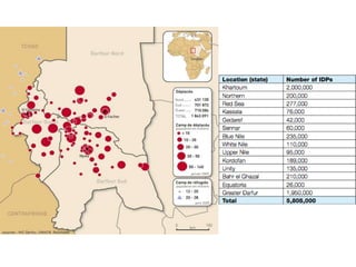 Sudan is located in Northern Africa, bordering Egypt and Eritrea. It has a population of over 45 million people, with ethnic and religious diversity. Sudan has experienced prolonged civil wars and conflict in Darfur has displaced over 2 million people since 2003. The ongoing conflict in Darfur is between the government and rebel groups, and involves government-backed Janjaweed militias carrying out attacks against civilian populations. As a result, there are over 5 million internally displaced people living in refugee camps with lack of basic necessities and ongoing insecurity and human rights abuses.