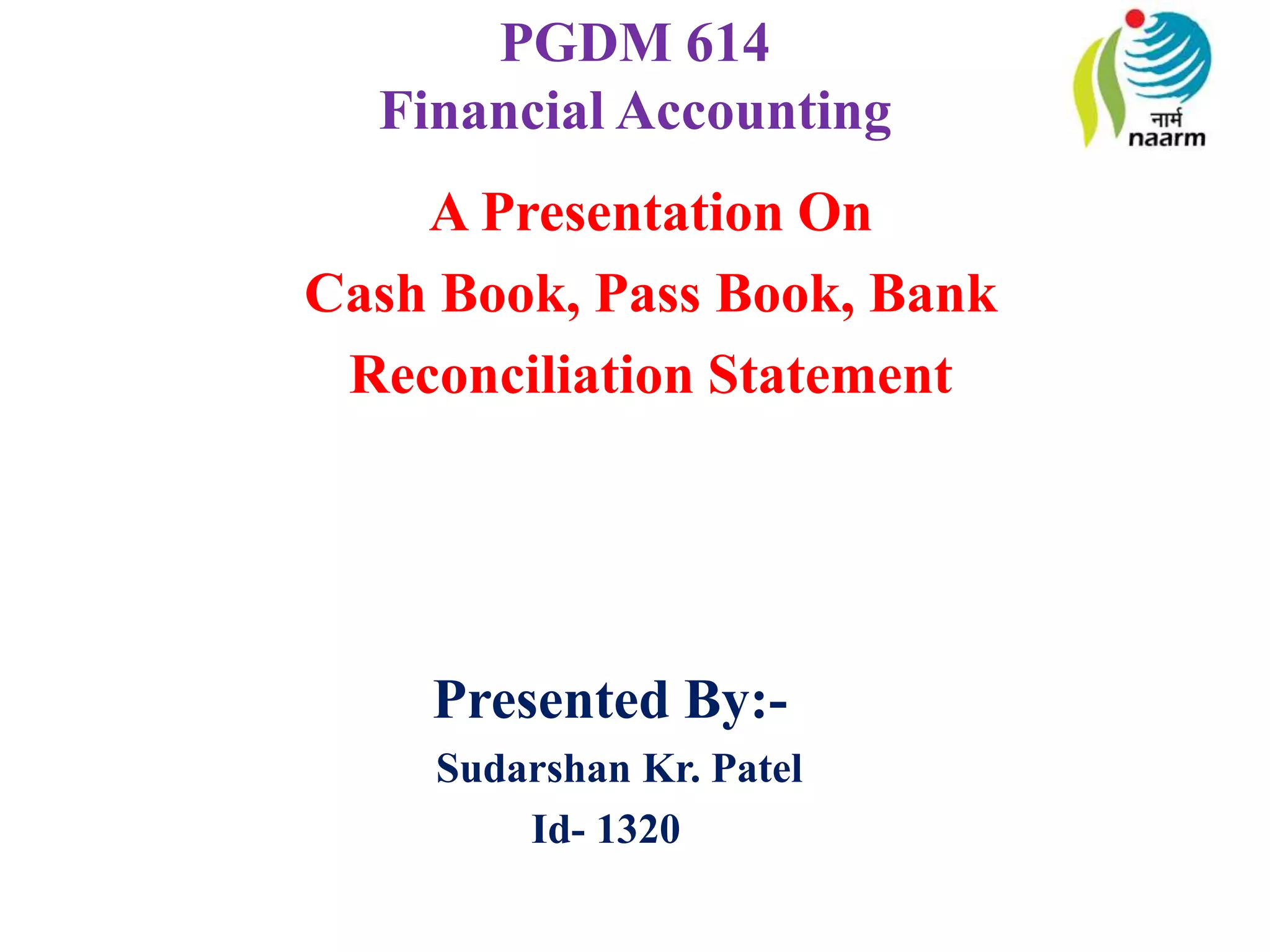 This document provides an overview of cash books, pass books, and bank reconciliation statements. It defines key terms like cash book, petty cash book, pass book, and bank reconciliation statement. It explains the different types of cash books (simple, two-column, three-column), and how to record transactions in each. It also outlines the process for preparing a bank reconciliation statement by identifying reconciling items that cause a difference between the cash book and pass book balances.