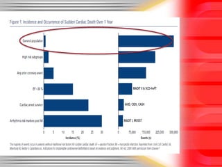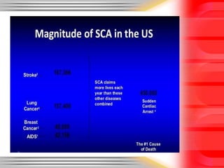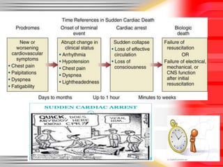 Sudden cardiac death is defined as a natural death from cardiac causes within one hour of the onset of symptoms. It can occur unexpectedly in people with known or unknown pre-existing heart disease. The main causes of sudden cardiac death are heart attacks in those over 35 and hypertrophic cardiomyopathy, commotio cordis, and coronary anomalies in those under 35. Pacemakers and implantable cardioverter-defibrillators have been developed to treat arrhythmias and help prevent sudden cardiac death.