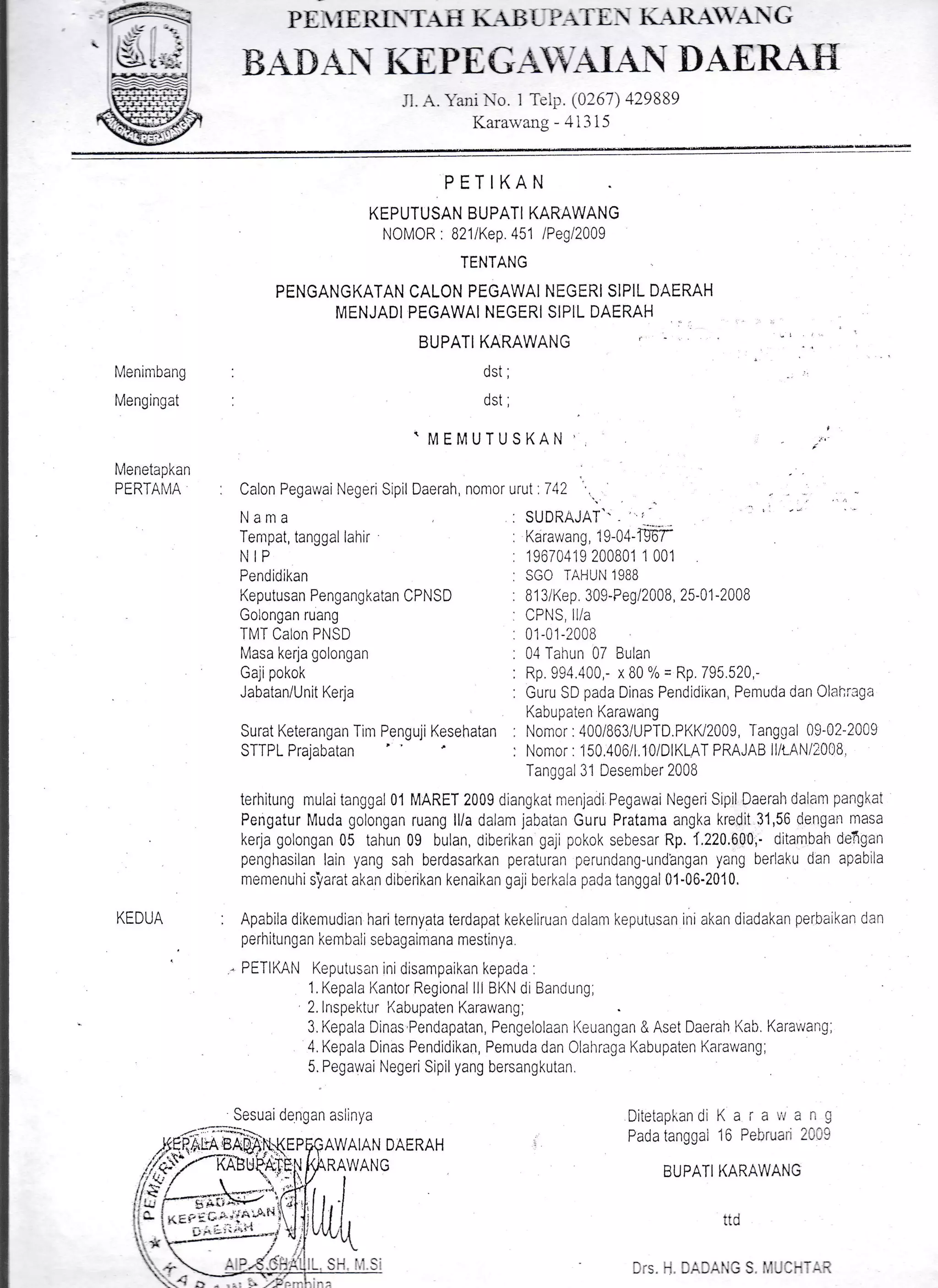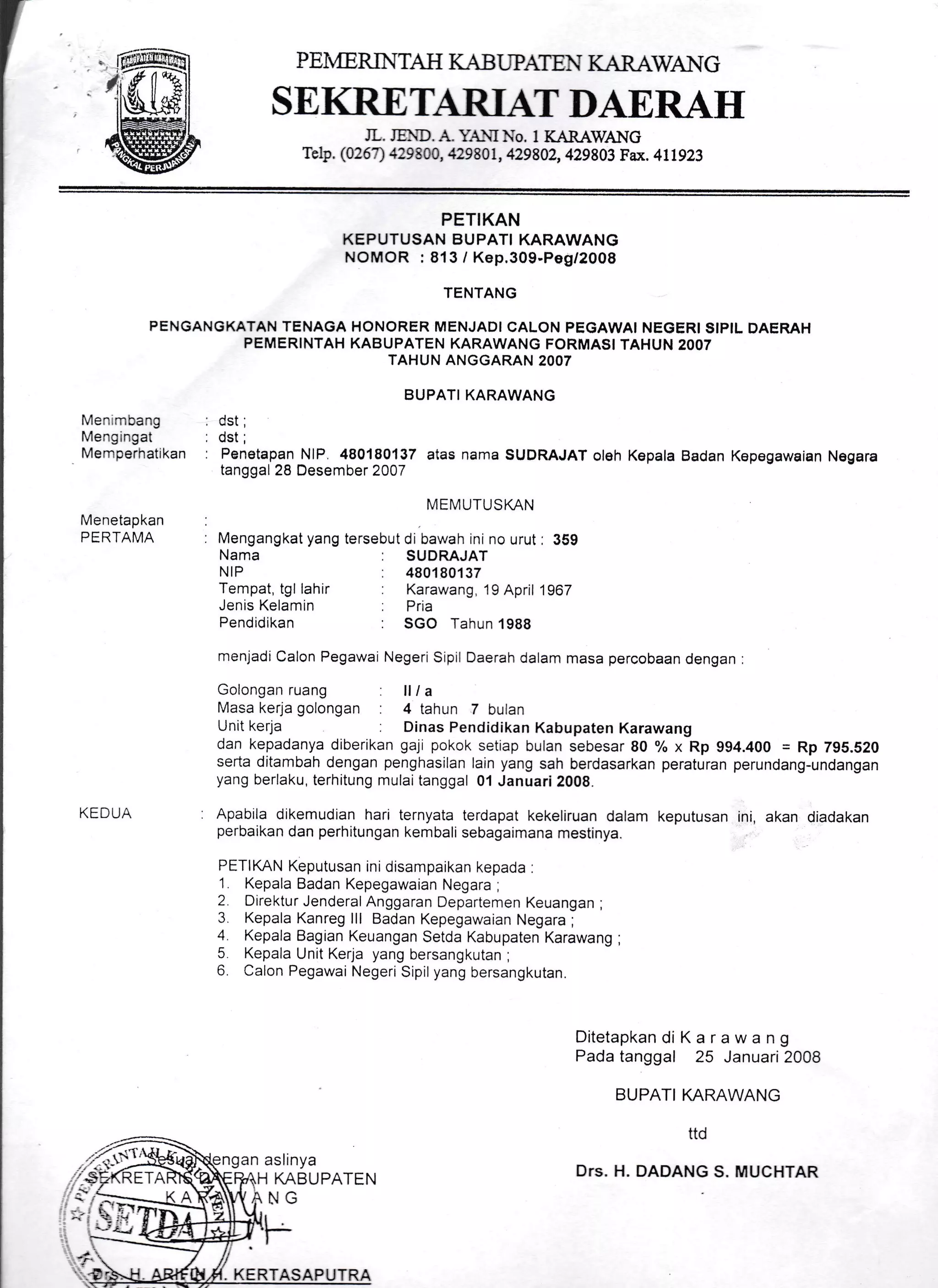 Keputusan Bupati Karawang mengangkat Sudrajat sebagai calon pegawai negeri sipil daerah pada 2008 dan mengangkatnya menjadi pegawai negeri sipil daerah pada 2009 dengan kenaikan pangkat dan gaji berkala sampai 2014.