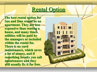 Sue and Dan are considering their best rental and home purchase options. Renting an apartment would be the most affordable option as it has lower expenses than renting a house or purchasing a home. However, a condo may also be a good lower-cost purchase option that has amenities like nearby shops. Purchasing a single-family home offers more privacy but would be more expensive with higher maintenance costs. Refinancing their current home at a 15-year fixed rate while consolidating credit card and car debt could save them hundreds of dollars per month by lowering interest rates and payments. This option makes the most financial sense given Sue's job loss and medical expenses.