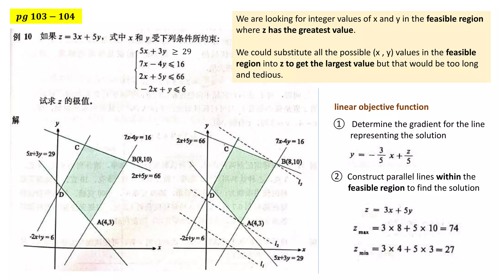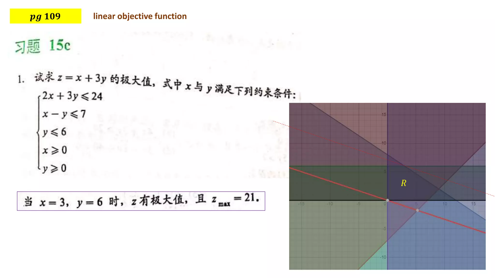 This document discusses using linear programming to solve optimization problems by finding the maximum or minimum value of an objective function subject to certain constraints. It provides two examples: 1) minimizing the cost of feeding buckwheat with two types of feed and nutrient constraints, and 2) maximizing the revenue from transporting goods with two factories subject to weight and volume constraints. Both examples set up the objective function and constraints, then solve to find the optimal value.