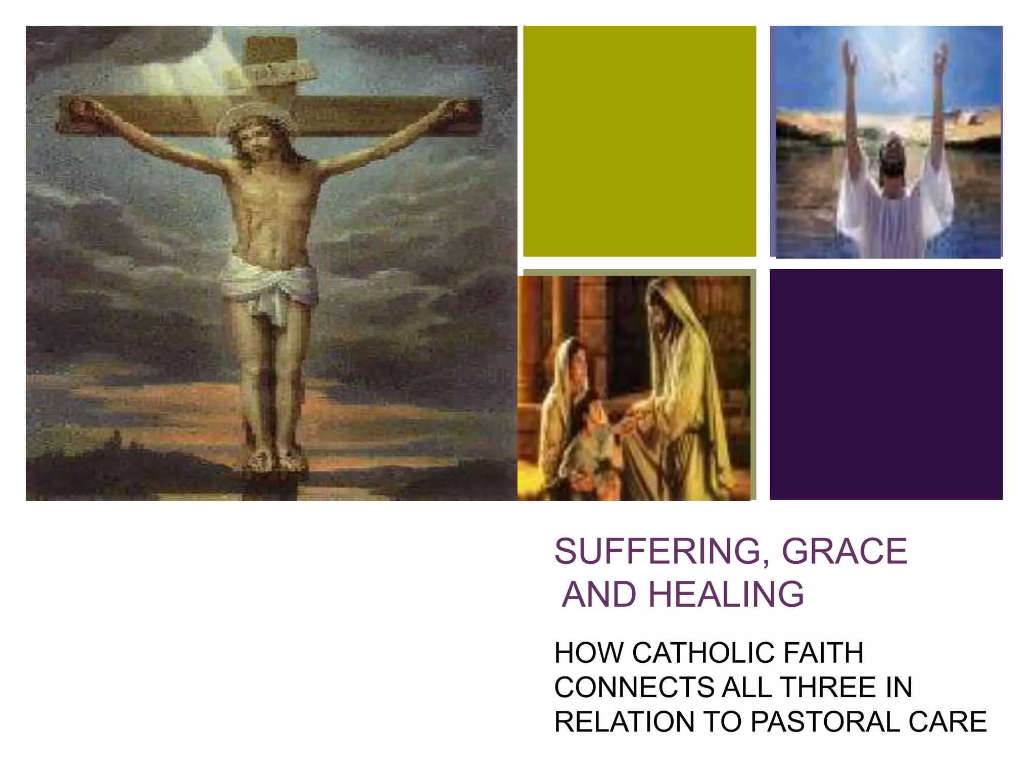 Pope John Paul II's apostolic letter Salvifici Doloris explores how Catholic faith connects suffering, grace, and healing in pastoral care. It explains that through God's grace, suffering can be transformed and joined to Christ's suffering for the redemption of sins. While suffering is not always a punishment, it can wake us to new spiritual life and prompt reaching out for God's help. The letter calls Christians to care for those who suffer with compassion, as Christ calls some to actively minister to the sick and dying through visible signs of God's healing love and forgiveness.