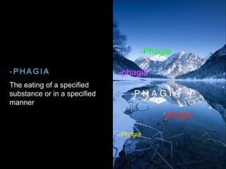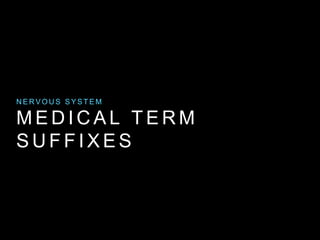 This document discusses medical suffixes related to the nervous system and paralysis or stroke. It describes suffixes like -phagia which refers to eating behaviors and conditions like polyphagia meaning excessive appetite. The suffix -plegia refers to paralysis and conditions it describes like quadriplegia meaning paralysis of all four limbs, paraplegia meaning paralysis of the lower body, and hemiplegia meaning paralysis of one side of the body. Common uses and definitions are provided for these medical suffixes.