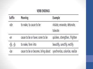 This document discusses suffixes and their uses. It defines a suffix as a word part added to the end of a word to modify its meaning or usage. It provides examples of common suffixes that can change words from nouns to adjectives or verbs to other parts of speech. The document emphasizes that understanding suffixes can help students learn new vocabulary by analyzing unfamiliar words. It includes activities for students to practice identifying and applying suffixes. Understanding suffixes is important for building vocabulary and language skills.