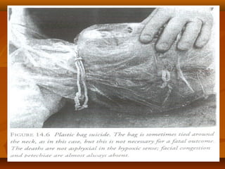 1. The document discusses different types of asphyxia including suffocation, strangulation, and chemical asphyxia. It provides details on six forms of suffocation - entrapment, smothering, choking, mechanical suffocation, mechanical suffocation with smothering, and suffocation gases.