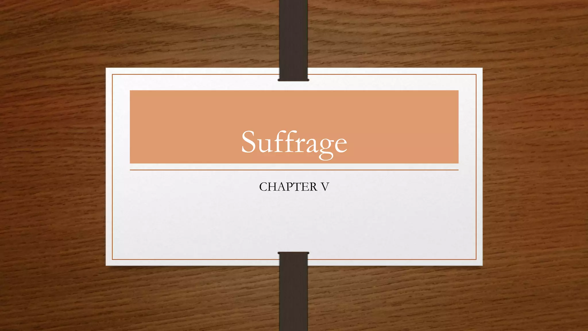 Suffrage is the right to vote of qualified citizens in elections and public questions. It is a political right, not a natural right, granted upon fulfilling minimum conditions. Suffrage may be exercised by Filipino citizens at least 18 years old who have resided in the Philippines for at least one year and in their voting place for at least six months prior. Congress provides for absentee voting and procedures for disabled and illiterate voters. Elections allow citizens to choose officials through processes like voting at precincts using voter lists and indelible ink. Plebiscites, referendums, initiatives and recalls are also discussed.