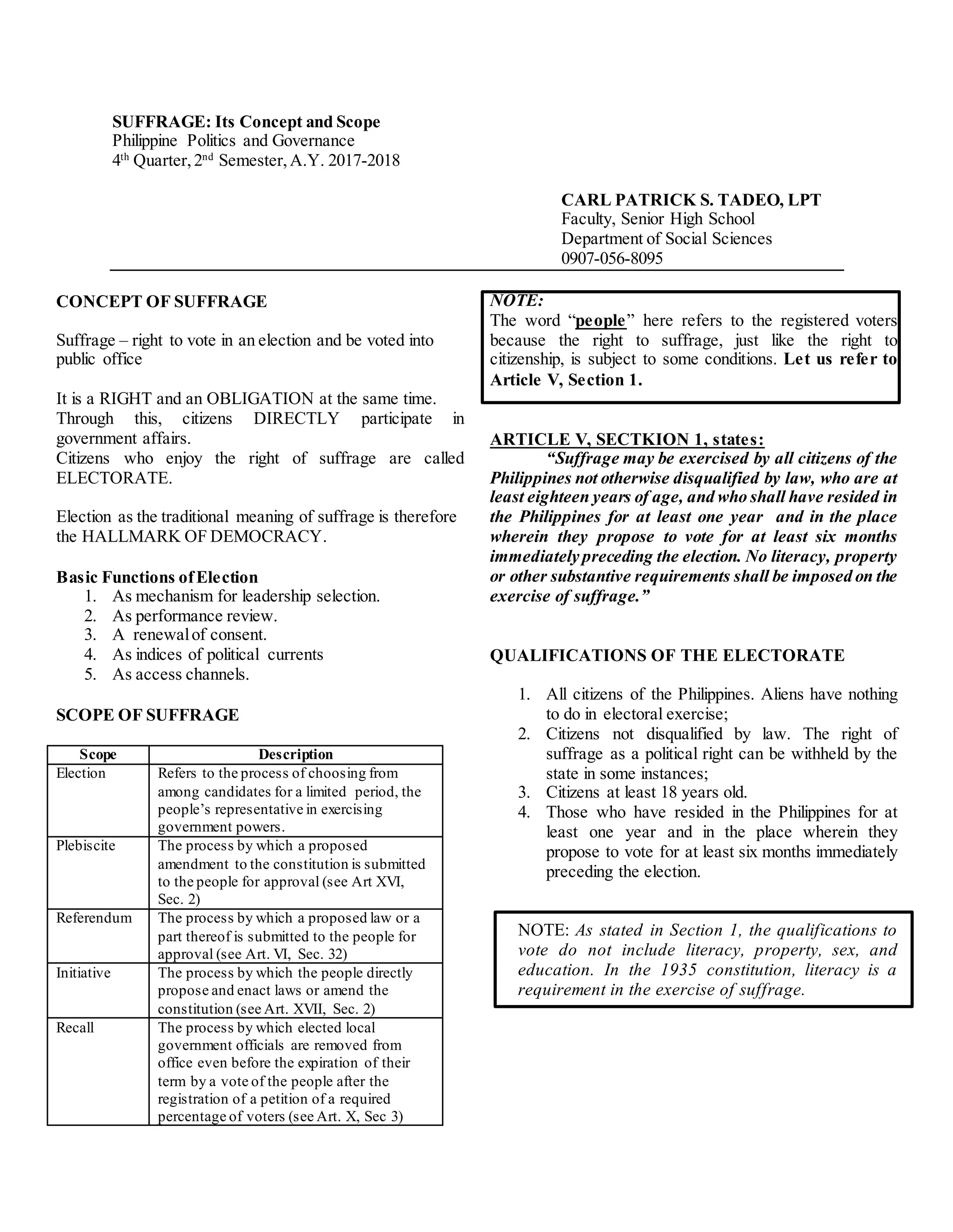 Suffrage refers to the right to vote in elections and hold public office. It is both a right and obligation for citizens, allowing them to directly participate in government. There are several forms and scopes of suffrage according to the Philippine constitution, including elections, plebiscites, referendums, initiatives, and recalls. Elections are held to select leaders and review their performance in a hallmark of democracy. To qualify for suffrage, one must be a citizen of the Philippines over 18 years of age who has resided in the country for at least a year and in their voting district for six months. Literacy and property requirements are prohibited.