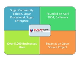 The document discusses the features and capabilities of SugarCRM, an open source CRM software. It describes SugarCRM's modules for sales force automation, marketing automation, customer support, reporting, and collaboration. Key features include opportunity management, contact management, account management, multi-channel campaigns, email marketing, case management, dashboards, and customization options like custom fields and module building.