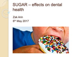 The document discusses the effects of sugar on dental health. It notes that consuming one can of soda contains the equivalent of 7 teaspoons of sugar. It also discusses how sugar releases dopamine in the brain similarly to cocaine, giving a temporary high. Regarding dental health specifically, excess sugar intake can lead to tooth decay, as sugar feeds the bacteria that cause decay. However, moderate sugar intake as part of a balanced diet is acceptable. The document provides solutions like drinking water, eating fruit, and implementing a sugar tax.